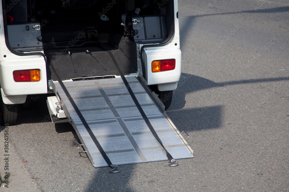 スロープ付き車両で車イスに乗車したまま目的地へ行けます。